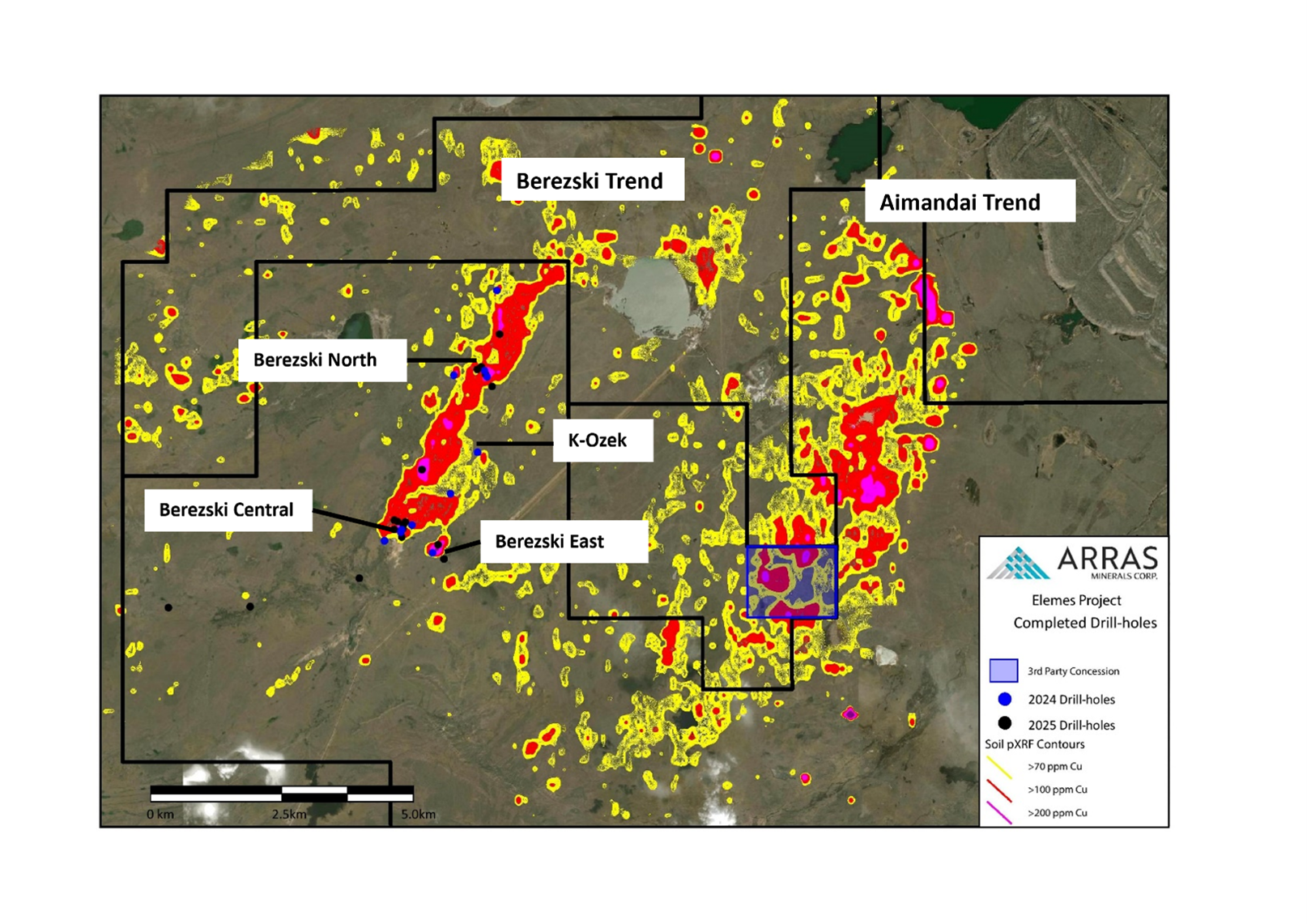 A property-wide soil sampling program conducted by Arras from 2022 to 2024, totaling more than 35,000 samples defined two large Cu-Mo-As geochemical trends called Berezski and Aimandai. A Phase 1 core drill program commenced in Q4 2024 with results announced in Q1 2025. A 20,000-meter, Phase 2 core drill program commenced in May 2025 which will continue into 2026.