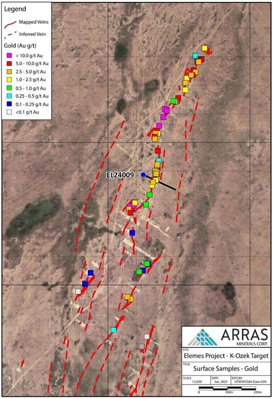 Plan map of the K-Ozek target showing location of drill-hole EL24009, mapped veins and grab sample locations.