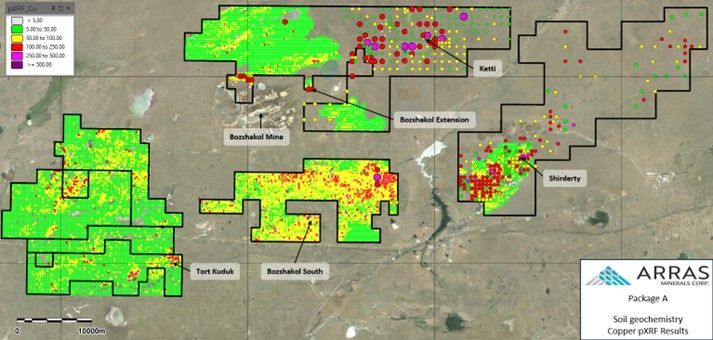 Arras controls an approximate 1.2km extension of the operating Bozshakol copper-gold mine trend that cover parts of a large historic chargeability anomaly. Soil sampling and KGK drilling returned porphyry pathfinder signatures and suggests that a second porphyry center may occur to the northeast of the Bozshakol Mine on Arras’ licenses.