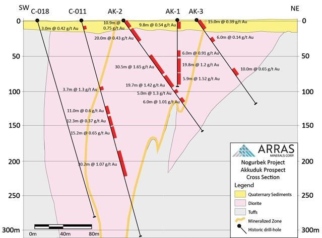 Arras geologists have identified several historic drill-collars in the field, and summary information in Soviet-era reports indicated significant gold intercepts hosted in diorites. Significant historic intercepts reported from the Akkuduk-Norgubek drilling include: