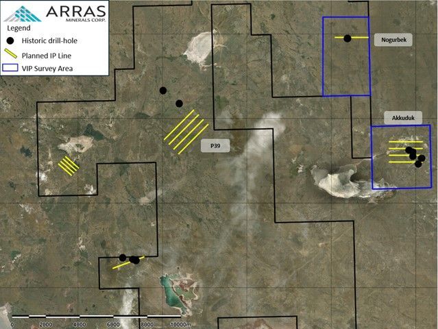 Plan map showing historic drill collars located in the field by Arras geologists and planned geophysics surveys.
