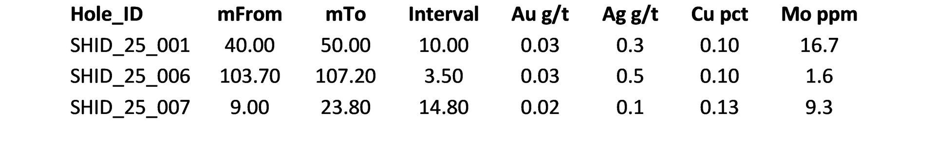 Table 1: Selected drill results, Shirderty Target
