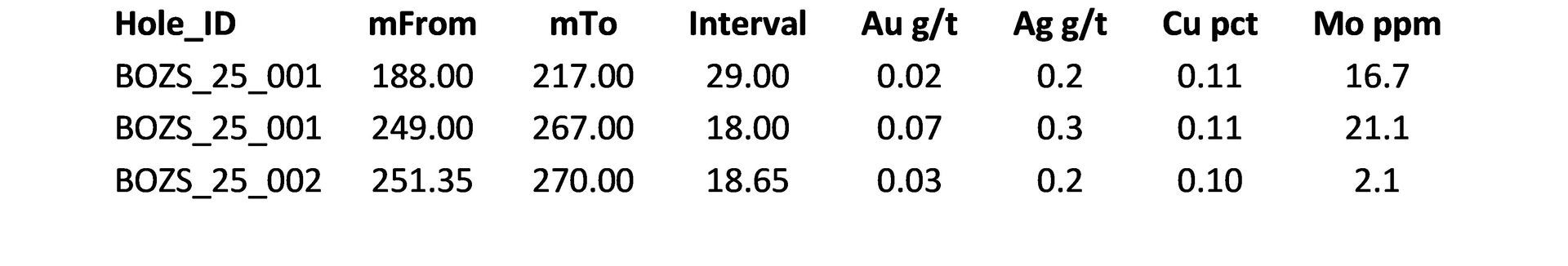 Table 2: Selected drill results, Boz S Target