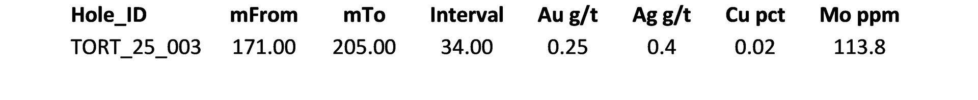 TORT25003, that intersected a porphyritic monzonite hosted in andesites with zones of stockwork A- and B-type veins with k-feldspar halos.