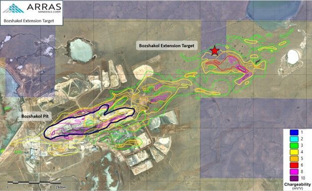 Location of the Bozshakol Extension Target related to historic chargeability anomalies and Bozshakol Mine. Arras License areas in shaded grey blocks.